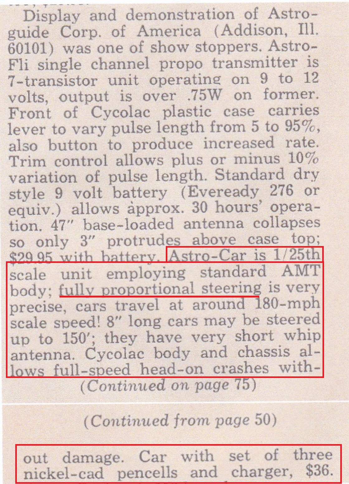 Below – A report in the above magazine on the 1965 Toledo RC Conference included news of several radio controlled models from the Astro-Guide Corporation of Addison, Illinois. One of the RC models was the Astro Car which used a plastic 1:25 scale AMT 1962 Ford body with a single channel, proportional radio.